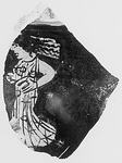 | Description: | Broken all around. From a small bell krater, reserved band near top. Outside, a Maenad, dancing, left; faded white streamers trail from her flying hair. Inside black glazed. ADDENDA A girl left, hands on hips, hair flying: on a seesaw? | |
