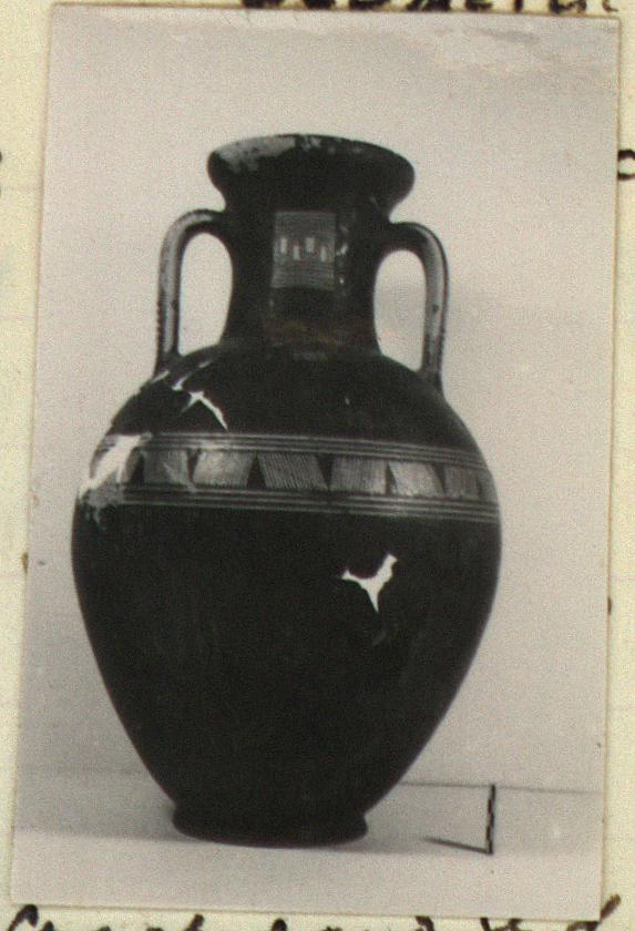| Description: | Cracked and broken in removal from grave. Complete but for chips. Heavy egg-shaped body, small flaring foot. Neck sharply offset from shoulder, slightly concave in profile, flaring up to deep thickened rim. Handles, neck to shoulder. Small reserved panel on neck containing segment of battlement maeander; above and below, zigzags. Belly stripe, opposed lines. Handles, herringbone; above and below, horizontal lines. Pinkish-buff clay. Glaze black, somewhat metallic. Iron stain on shoulder and one handle from sword wrapped around it (IL 1058). | |