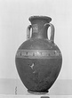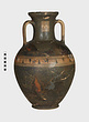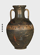 | Description: | Cracked and broken in removal from grave. Complete but for chips. Heavy egg-shaped body, small flaring foot. Neck sharply offset from shoulder, slightly concave in profile, flaring up to deep thickened rim. Handles, neck to shoulder. Small reserved panel on neck containing segment of battlement maeander; above and below, zigzags. Belly stripe, opposed lines. Handles, herringbone; above and below, horizontal lines. Pinkish-buff clay. Glaze black, somewhat metallic. Iron stain on shoulder and one handle from sword wrapped around it (IL 1058). | |