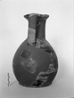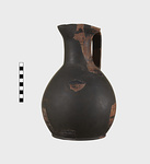 | Description: | Mended from many fragments, about three-fourths plaster. Profile certain. Sacklike body, sagging shoulder, greatest diameter very low. Broad base, low ring foot. Neck flares out to trefoil mouth. Handle, rim to shoulder. Beginning of reserved panel at mid-neck preserved. Handle, herringbone; above and below, bars. Pinkish-buff clay. Black glaze much effaced. Signs of burning. | |