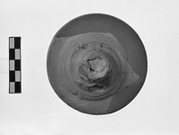 Description:   About half of edge missing; knob chipped. Restored in plaster. Roughly stepped profile rising to crude knob.