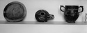 Description:   Mended from many small pieces; fragments of rim and walls missing. Concave-convex type; ring foot, plain rim. Ivy leaf thumb-rest on top of band handles; wreath in thinned clay paint front and back in handle zone.