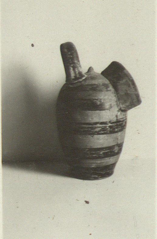| Description: | Mended from many fragments; small fragments still missing from sides and lower edge of the spout. Above the hood-shaped edge of the spout is a small protuberance at the top of the vase. Beyond this, a high swung handle. Oval body; flat bottom. Clay light reddish-buff; horizontal stripes of the brownish black glaze which also decorates the upper surface of the hood and the handle. | |