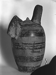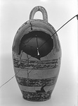 | Description: | Mended from many fragments; small fragments still missing from sides and lower edge of the spout. Above the hood-shaped edge of the spout is a small protuberance at the top of the vase. Beyond this, a high swung handle. Oval body; flat bottom. Clay light reddish-buff; horizontal stripes of the brownish black glaze which also decorates the upper surface of the hood and the handle. | |