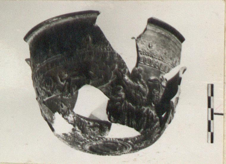 | Description: | Parts of lip and wall missing. Restored in plaster. Medallion: gorgoneion encircled by beaded line and scraped groove. Calyx: single row of feathered leaves with flying Erotes between. On wall, alternating Tritonesses and Erotes riding dolphins with birds above and below. Upper zone egg pattern, beaded line, spirals and leaves. Scraped line with miltos below lip. From mold P 6908 (ΠΘ 649). Good black glaze. ADDENDA Medallion from same stamp as P 18641 and P 20273. | |