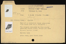 Description:   Part of an elaborate dress ornamented with large dots and a fringe(?). The drapery indicated by fine nearly parallel relief lines, fringe and dots by much heavier lines. Sketchy work.