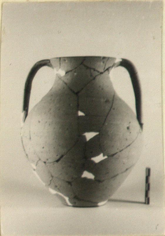 | Description: | Part of lip and neck and minor fragments of body missing; restored in plaster. Flat bottom; ovoid body; two flat vertical handles attached to lip and shoulder. Dark pinkish-buff clay with small grits. Unglazed. | |