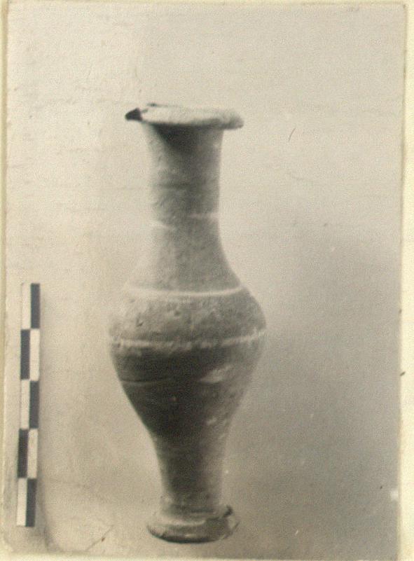 | Description: | Intact. Neat fusiform with good base and downturned rim. Three white lines. Dark brown clay. Lighter surfacing. Cf. Agora XXXIII, no. 426. | |