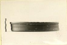 | Description: | Part of rim and floor preserved. Vertical rim with projecting mouldings above and below; rouletted band between. Flat floor with broad band of rouletting between light grooves. Red clay. Lustrous red glaze. Western Sigillata Ware. | |