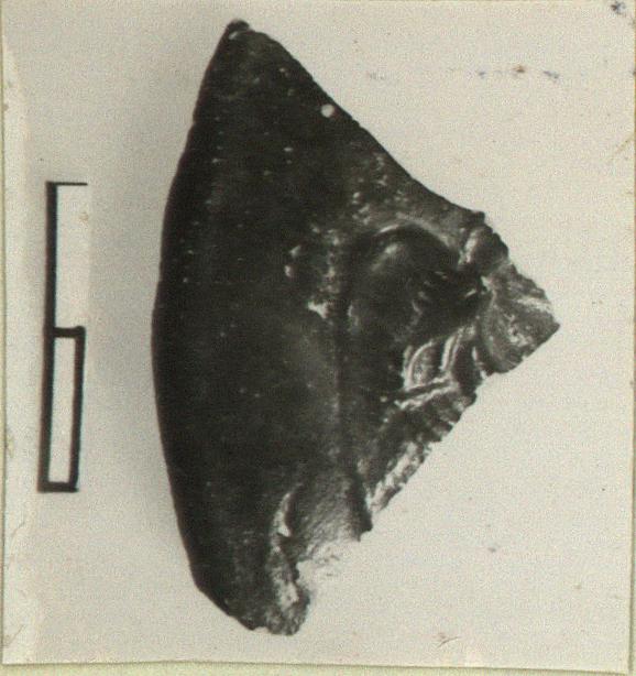 | Description: | Small fragment from the top of a black glazed askos with moulded decoration: wing. | |