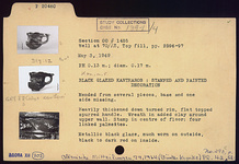 Metallic black glaze, much worn on outside, black to dark red on inside.