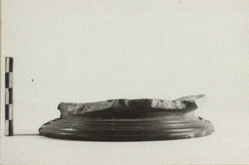 | Description: | A little over half of base with adjoining floor preserved. Low spreading base with broad resting surface; base grooved above and below. Mostly red glazed, with patch of black in center of floor. Attic. Base for large kantharos or open pot like P 5928 ? | |