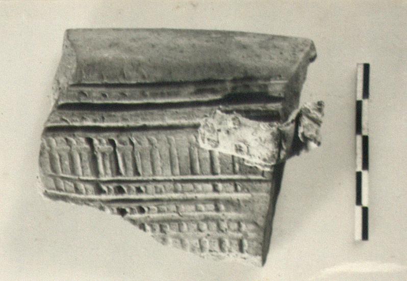 | Description: | Fragment from flat projecting rim. Vertical and horizontal striations on interior. Part of lead mending clamp attached near rim. Pinkish-buff clay. | |