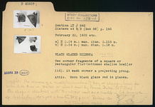 | Description: | Two corner fragments of a square or rectangular flat-bottomed shallow bowl (or lid). At each corner a projecting prong. Attic. Worn black glaze, red in places. | |