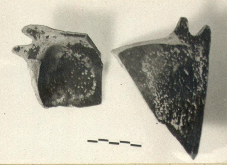 | Description: | Two corner fragments of a square or rectangular flat-bottomed shallow bowl (or lid). At each corner a projecting prong. Attic. Worn black glaze, red in places. | |