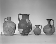 | Description: | Mended from many pieces, few pieces from side, from handle and chips on rim missing. Round-bodied pitcher with tall narrow neck, flat-topped lip; grooved strap handle; ring foot. Buff clay; matte black to brown glaze on upper two-thirds. | |