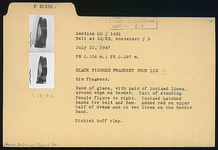 Description:   Rim fragment. Band of glaze, with pair of incised lines, around edge as border. Part of standing female figure to right. Incised hatched bands for belt and hem. Added red on upper half of dress and in two lines on the border band.