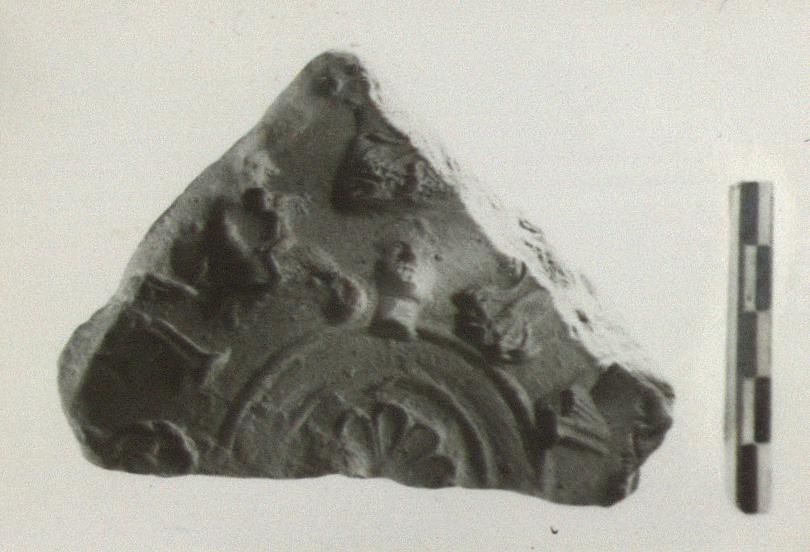 | Description: | Half of base and small part of wall. Rosette in medallion; Nikai, Erotes, masks, etc. on wall. Buff clay. | |