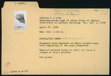 | Description: | [Originally identified as shoulder fragment of small closed vase.] Head of bridled horse to left; in field a length of braid pattern. Red glaze. | |