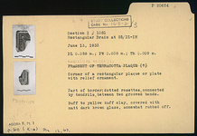 | Description: | Corner of a rectangular plaque or plate with relief ornament. Part of border: dotted rosettes, connected by tendrils, between two grooved bands. Buff to yellow-buff clay, covered with matte dark brown glaze, somewhat rubbed off. | |