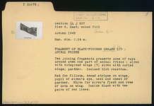 | Description: | Two joining fragments preserve some of rays around stem and part of animal frieze: Siren with outspread wings(?), Siren with curled wings; panther. Incised blob rosettes. Red for fillets, broad stripes on wings, pupil of Siren's eye, neck and chest of panther. White for Siren's flesh and rows of dots on wing. Inside black with two pairs of red lines. | |