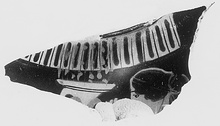 | Description: | From shoulder of a lebes gamikos; plastic ring at start of neck. Head of a woman to left and top of a loutrophoros; flowers in added red in loutrophoros, extending up to tongue pattern above; the woman is probably tying fillets around the loutrophoros. | |