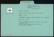 | Description: | Single fragment preserves part of floor and profiled foot. Incised and stamped loops on floor, around a medallion. Black glaze all over. | |