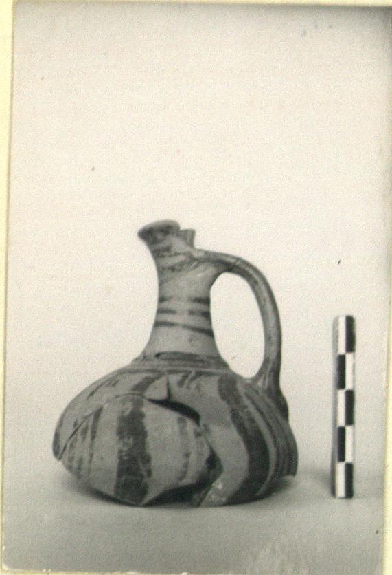 | Description: | Mouth, neck, handle and upper half of body preserved; two non-joining fragments from lower body. Tall neck; spouted mouth; small projection at lower handle attachment. S-shaped vertical bands on upper body; alternately broad and made up of three narrow lines; groups of lines on neck; upper surface of handle glazed. Typical Mycenaean clay and glaze. | |