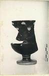 | Description: | Mended from several fragments; handles and much of rim and upper wall missing; profile complete. Simple cup foot with short stem. Deep rounded lower body lightly offset from steep upper wall; plain slightly flaring rim. Good blue-black glaze. Vertical face of foot, resting surface and center of cone within foot reserved. Two scraped grooves around stem, one at junction with bowl, the other below. Decoration on upper wall just below rim: ivy wreath, the leaves reserved, the stems and berries in faded white. For the wreath, cf. P 2322; for the shape, Richter and Milne (1935), fig. 169, with same foot, but cup more squat. | |