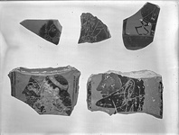| Description: | Handle fragment. Handle is the column krater type; the horizontal top piece is preserved with the outer edge missing. The stump of the vertical support can be seen underneath. A male head is seen in profile left, against a pinkish cream background. The figure has a pointed, projecting beard, and a twisted lock of hair hanging down his back. Head broken off at forehead and in middle of neck. Incision used to set off the line of the hair and beard, and to indicate a volute-like ear. Corner of mouth and the large circular eye are also incised. Flesh color indicated by purple paint. Deep pink clay. Brownish-black glaze, the sides and underneath part of the handle covered with the same glaze, which extends on to the upper surface to form a narrow frame for the head. | |