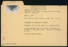 | Description: | Fragment of rim and body of a large krater. A long-necked bird in a panel, flanked by groups of vertical lines; groups of streaks on rim. Inside, streaky glaze. | |