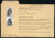 | Description: | Mended from many pieces. Small fragment from mouth and much of side wall missing. Shape as P 20729; better articulated neck and smaller base, high swung handle. Neck and lip glazed solid. On shoulder, reserved panel containing three running beasts (dogs?). Further below: zigzag zone. Surface much destroyed. Dull reddish-brown glaze. Fragments from at least three other oinochoai of same shape and similar decoration in tins. | |