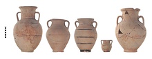 | Description: | Mended from many pieces. One handle, fragments from rim and side walls and chips missing. Flat bottom; full body; no neck; wide mouth; handles from rim to shoulder; rim on one side pinched to form shallow open spout. Pairs of bands on body; handle barred. Surface mostly lost. Glaze decoration was red-brown. | |