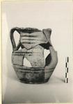 | Description: | Mended from many pieces. One handle, fragments from rim and side walls and chips missing. Flat bottom; full body; no neck; wide mouth; handles from rim to shoulder; rim on one side pinched to form shallow open spout. Pairs of bands on body; handle barred. Surface mostly lost. Glaze decoration was red-brown. | |
