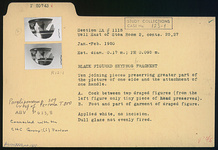 | Description: | Ten joining pieces preserving greater part of the picture of one side and the attachment of one handle. A) Cock between two draped figures (from the left figure only tiny piece of head preserved). B) Foot and part of garment of draped figure. Applied white, no incision. Dull glaze, not evenly fired. | |