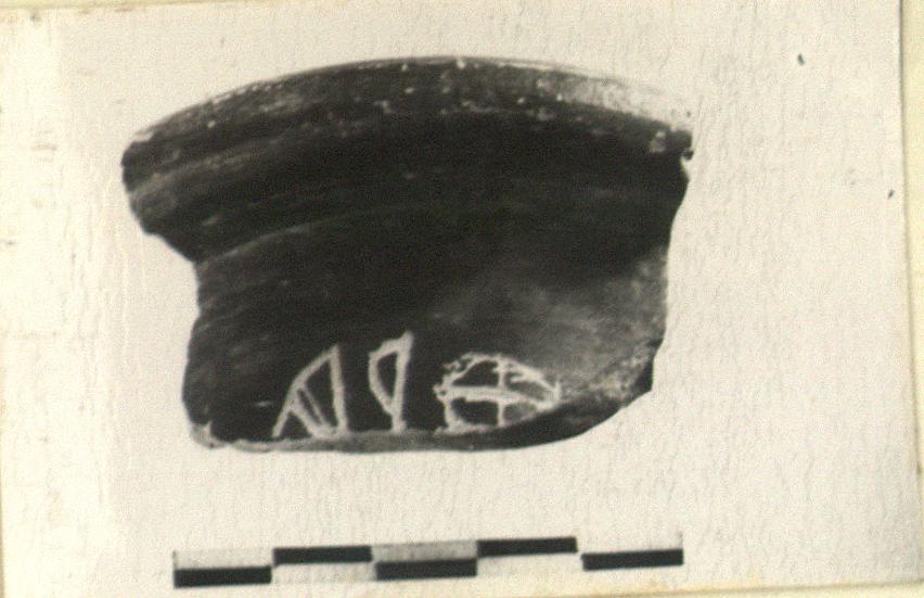 | Description: | Fragment giving part of rim and neck. Thick rounded rim. Graffito on outside: <graphic> Dull smeary black glaze outside, and extending to below rim inside. | |