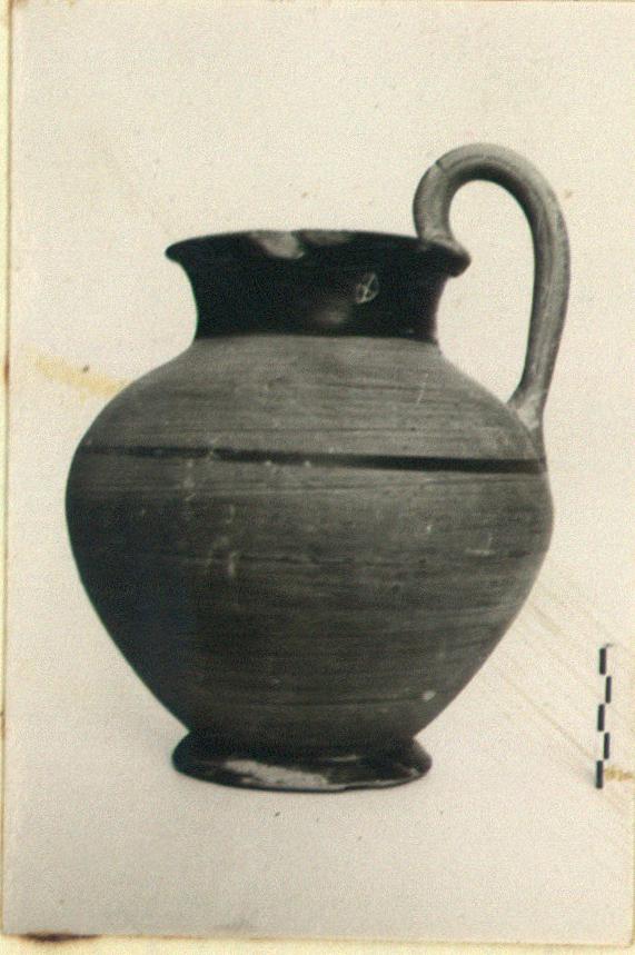 | Description: | Handle, part of rim and part of base broken off and mended; chips missing. Plump jug with flaring ring foot, wide round mouth, narrow projecting rim; rising band handle from rim, its surface concave. Dull black glaze on neck, both inside and outside; in one line below the handle all around the body and on the outer face of the foot. The rest covered with a light brownish wash. Graffito on neck: <graphic> | |