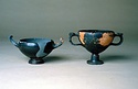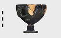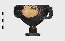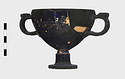 Description:   Foot, rim fragments and both handles missing; restored in plaster. Hemispherical cup with horizontal handles on stemmed foot. Broad band of decoration in handle zone: tendrils, ivy leaves and berries, all in added clay.