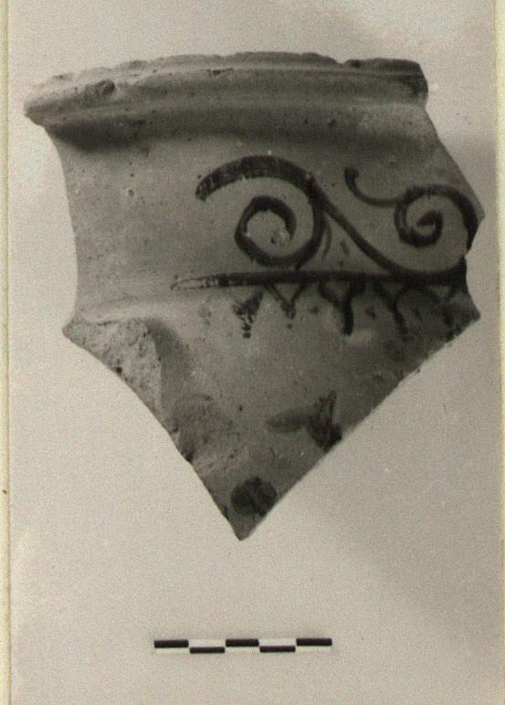 | Description: | Fragment from a large krater with curving shoulder and vertical neck with out-turned lip. Break for handle attachment on shoulder at left. Decoration in dilute glaze: on neck, running spirals with modified egg pattern design below. Ivy leaves on shoulder. Slightly gritty red-buff clay. | |