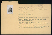 | Description: | Single fragment with part of stem and floor of a red figured kylix. Left side and hand of figure holding something in his closed left hand. Ring around stem, set off by two scraped grooves. Top of truncated cone beneath, reserved. | |