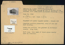 | Description: | Complete profile preserved; most of rim and wall missing. Steep rim profile; rim grooved in different levels; ring foot. Buff clay. Thin wash of black glaze mostly worn on interior. | |