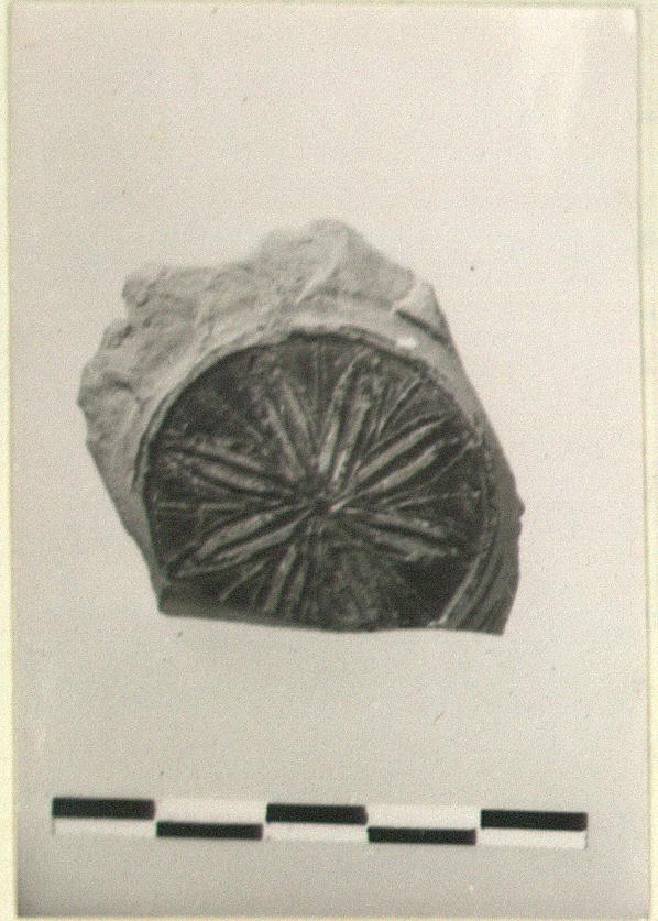 | Description: | Medallion: large eight-petalled flower. Pinkish-buff clay. Glaze black on interior, red on exterior. | |