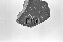 | Description: | Broken on all edges; a bit of the circular groove left. In the center, in a rectangular stampe: V I B I Light reddish-buff clay; excellent red glaze. Western Sigillata Ware. | |