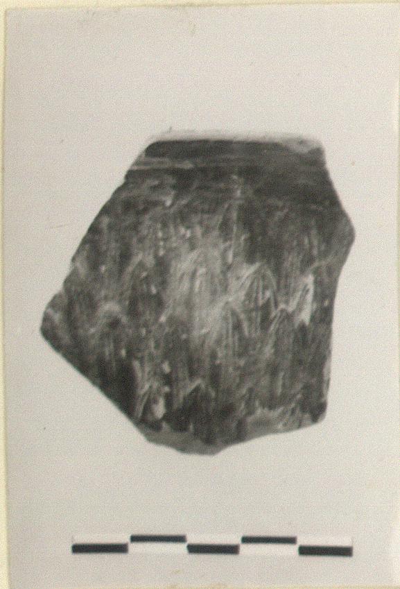 | Description: | Scraped groove with miltos below rim. On wall, imbricate ovoid leaves. No upper zone. Pinkish-buff clay. Black glaze. | |