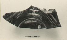 | Description: | Part of base and floor preserved. Ring foot, gently rising floor. On interior part of a grooved circle with wheat ear or palm branch, and bit of another ornament in yellow and white. Around edge, necklace design and a basin or brazier on a wide base, also in yellow and white. Resting surface reserved; a scraped groove at junction of foot and floor outside, and another inside around center of floor. Pinkish-buff clay, black glaze. | |