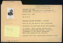 | Description: | Part of lip and much of wall preserved. Outcurved lip with West Slope vine pattern on inside. Wall covered outside with gradually decreasing nodules. Point of attachment of one handle preserved. West Slope medallion on interior. Pinkish-buff clay; black glaze shading to red. | |