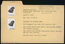 Description:   Rim fragment from bowl with vertical rim. West slope decoration above: ivy garland between two scraped grooves. Two zones with moulded decoration below: spirals; egg and dart pattern.
