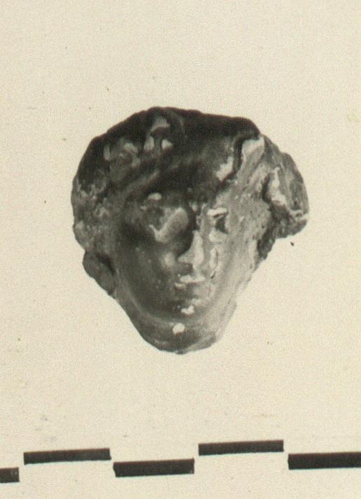 | Description: | Wreathed head, tipped slightly to left, from an amphora handle attachment. Nose, eyes damaged. Black glaze outside, somewhat worn; inside thin, as if for glue. | |
