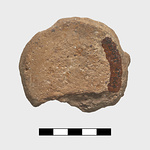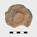 | Description: | Small handmade disk, probably a lid. Flat bottom, sides bevelled back toward bottom. On the upper surface at the center, a slightly raised circular area, 0.032m. diam., below which are marks of fingers drawn in a sweeping oblique motion from the edge of the raised area toward the periphery. Fabric as P 993: reddish to buff clay slightly micaceous with dark and white bits. | |