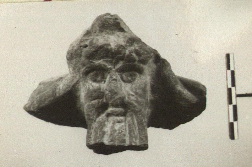 | Description: | Small piece of brazier rim only; the top of the lug broken off, and the end of the beard. Massive face with broad beard. The clay burned gray. | |